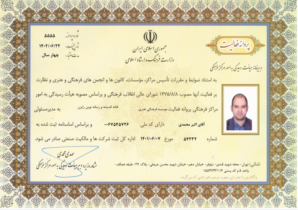 با مجوز رسمی وزارت فرهنگ و ارشاد اسلامی (شماره ثبت ۵۴۲۳۲، شناسه ملی ۱۴۰۱۱۴۵۷۶۵۷) بهعنوان یک موسسه فرهنگی چندمنظوره فعالیت میکند.