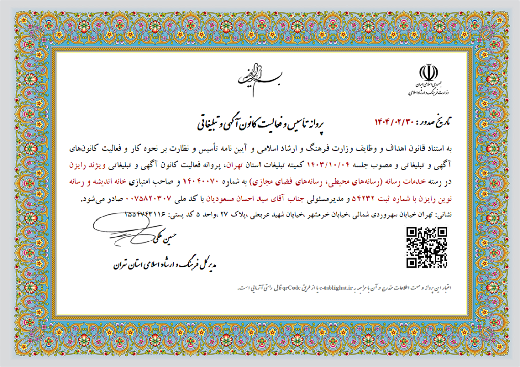 دارای مجوز رسمی فعالیت خبری–تحلیلی از وزارت فرهنگ و ارشاد اسلامی، با رویکردی مستقل برای بازتاب اخبار و تحلیلهای فرهنگی، اجتماعی و هنری.